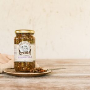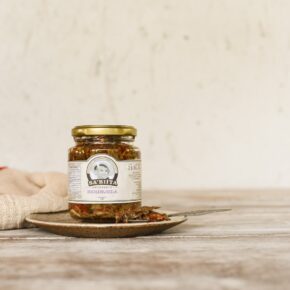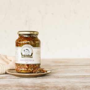 Este antepasto não vai ao fogo. A berinjela passa por processos sucessivos de prensagem e desidratação. Desta forma, preservam-se as propriedades nutricionais do vegetal pela ausência da alta temperatura. As lâminas de alho, azeitona verde, pimentão vermelho ralado e orégano fresco conferem característica de sabor marcante para este produto. Durante a montagem, todo o pote é coberto por azeite.